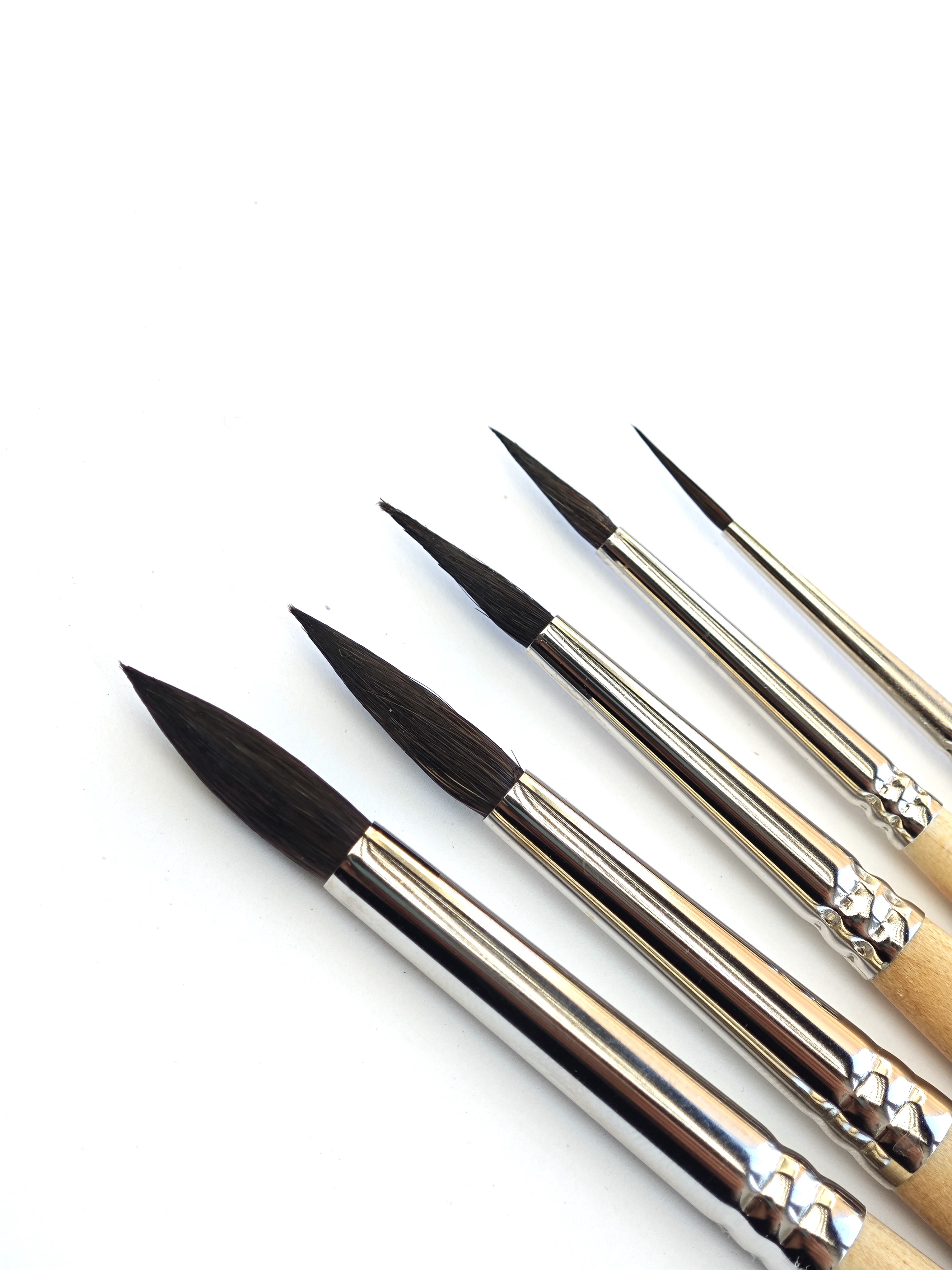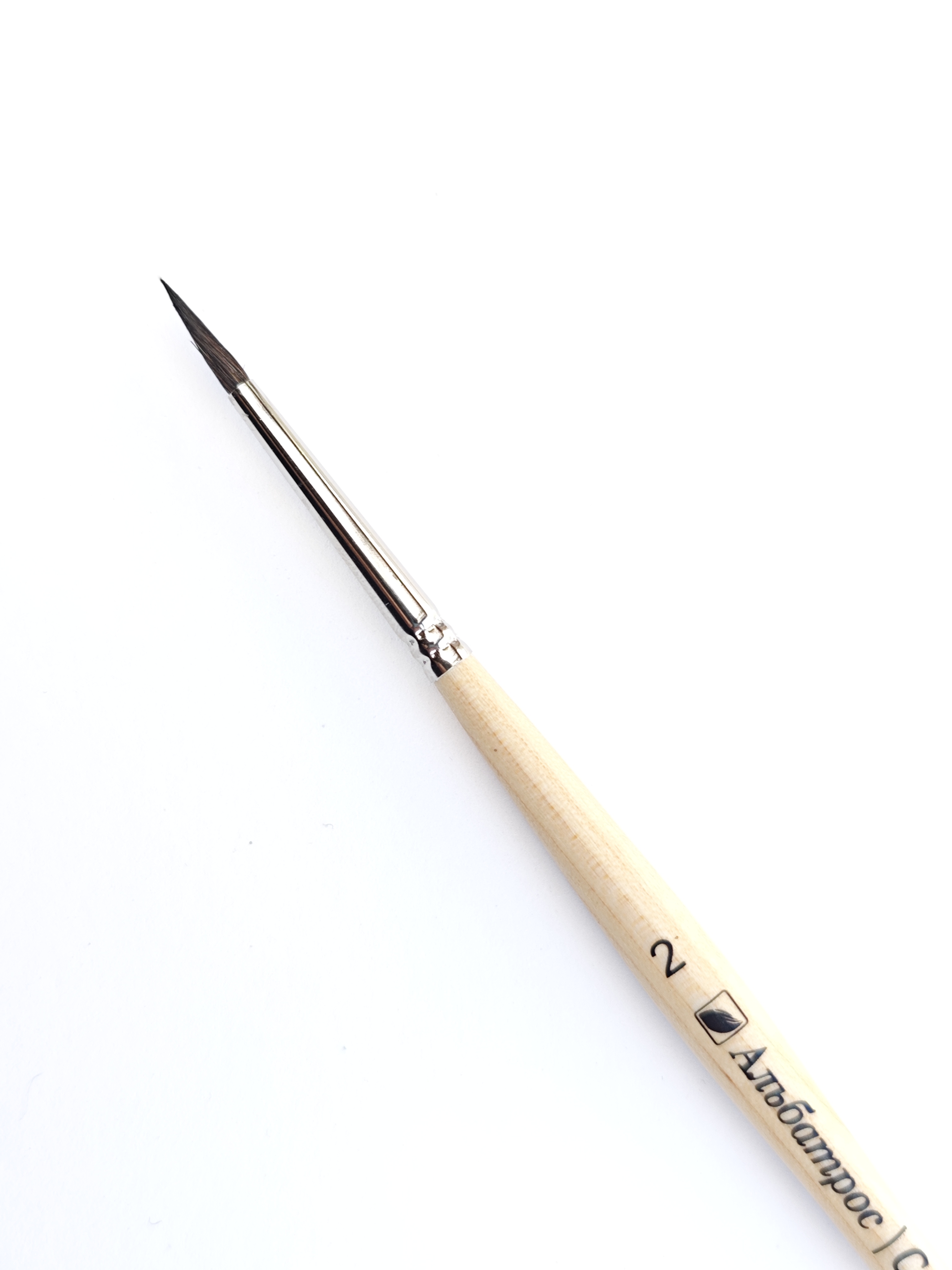 Вершинка кисти тонко заострена. Кисть, имеющая такой волос, позволяет работать не только жидкими красками. Но для акварели этот волос лучший, и замены ему нет. Беличий волос прекрасно сохраняет форму, не ломается, впитывает влагу и хорошо моется под проточной струей воды.
