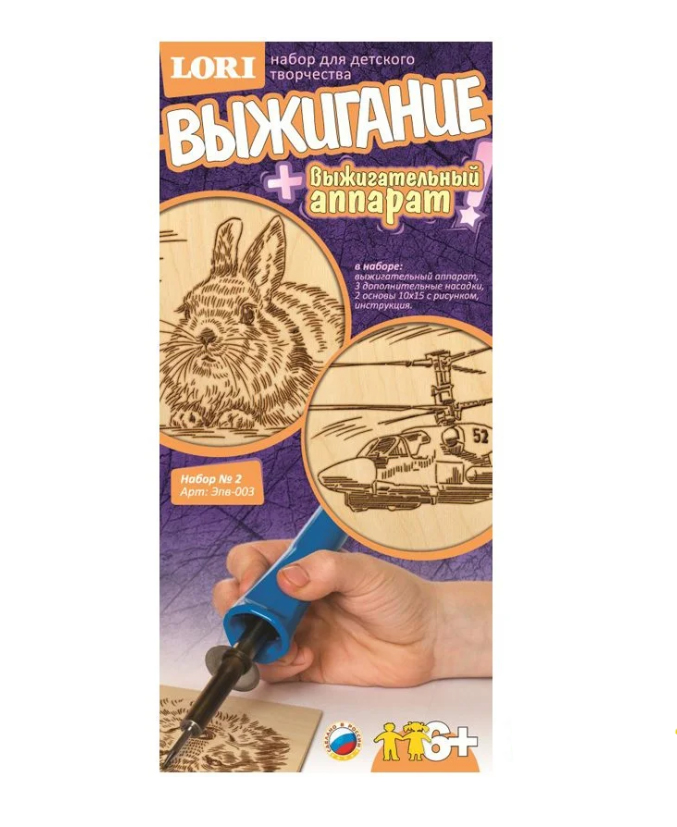 В состав наборов входят: выжигательный аппарат, 3 дополнительные насадки, 2 основы с рисунком. Набор, состоящий из выжигателя, 6-ти сменных насадок и ножа, предназначен для выжигания художественных узоров, рисунков и изображений на деревянных поверхностях и коже. Специальная подставка в наборе обеспечивает дополнительное удобство применения.