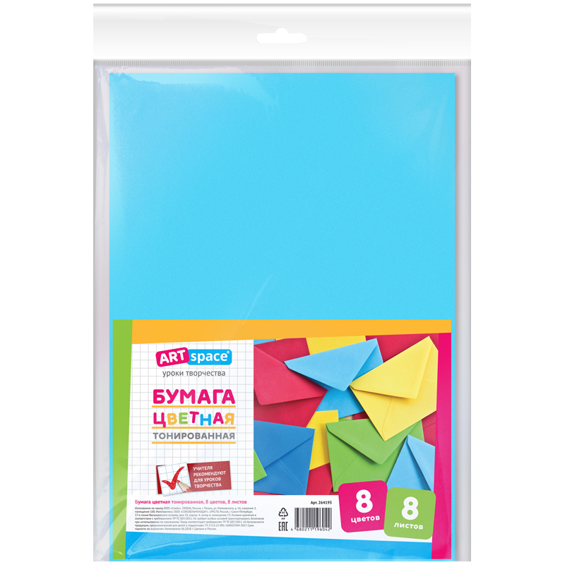 Работа с цветной бумагой способствует развитию мелкой моторики у детей. Сгибание, вырезание, разрывание, наклеивание — все это стимулирует деятельность пальцев. Виды творчества предусматривают создание поделок в технике аппликации и объемных изделий, используется при моделировании и проектировании, для создания аппликаций, поделок и поздравительных открыток, декорирования предметов, оформления помещений и многого другого, легко создавать украшения. Цветной бумаге уделяют повышенное внимание и активно применяют для хобби и творчества в технике создания картин и объемных фигур с помощью скрученных разными способами узких бумажных полосок. Цветная тонированная бумага ArtSpace универсально подходит для обучения разным видам творчества. С этой бумагой приятно и удобно работать, а созданные из нее аппликации и игрушки смотрятся красочно и аккуратно. В наборе 8 листов формата А4 разных насыщенных цветов в пакете с европодвесом.