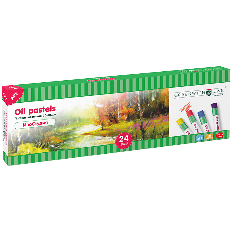 Масляная пастель отличается интенсивностью и яркостью цвета, хорошой укрывистостью, смешиваемостью и мягкостью. Легко ложится на различные фактуры бумаги, картона, дерева, керамики. Подходит для работы на открытом воздухе. Рисунок, выполненный масляной пастелью, не нужно закреплять. В наборе 24 цвета: белый, охра оранжевая, желтый, желтый темный, сепия, охра жёлтая, оранжевый, красный темный, бледно-розовый, темно-розовый, рубиновая, алый, зелено-желтый, зеленый, темно-зеленый, кобальт зеленый, цвет морской волны, церулеум, кобальт синий, пурпурный, сиена жжёная, коричневый, серый, черный.