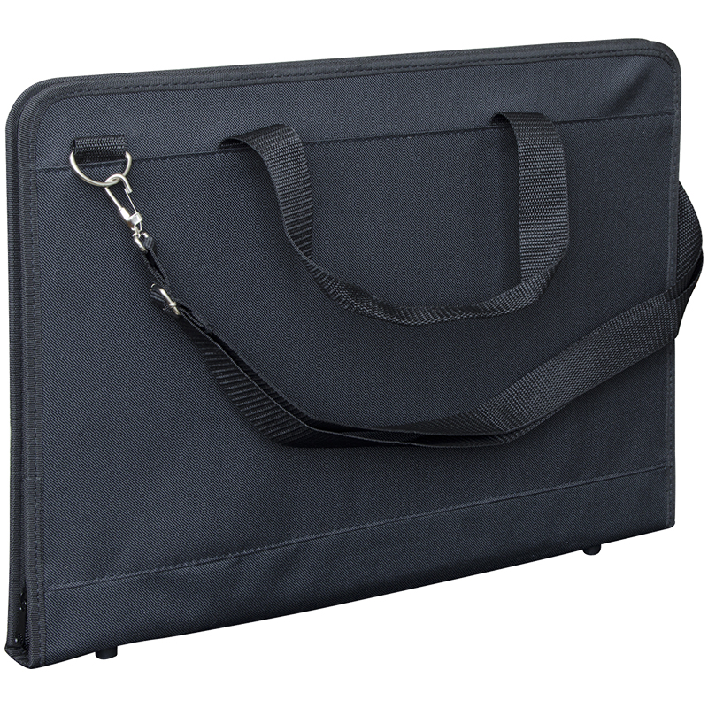 Папка для художников формата А1. Листы крепятся с помощью двух эластичных отстегивающихся лент. Снабжена ручками и съемным плечевым ремнем. Дно папки предохраняют пластиковые "ножки". Материал - полиэстер. Размер 920*680*35 мм.