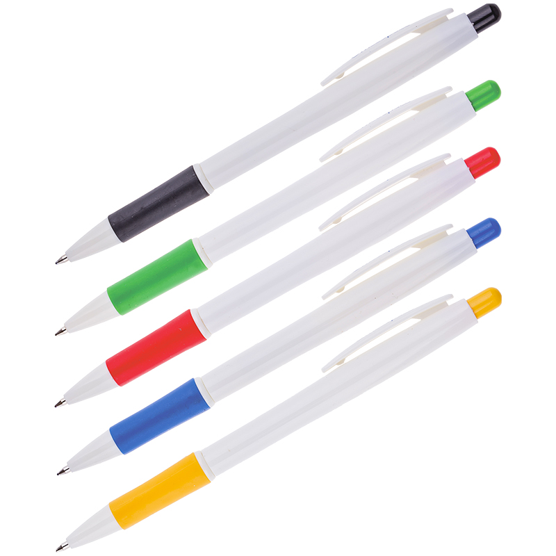 Автоматическая шариковая ручка. Непрозрачный тонкий пластиковый корпус белого цвета. Отдельные детали тонированы в цвет чернил. Специальная резиновая накладка грип-зоны препятствует выскальзыванию ручки из пальцев.