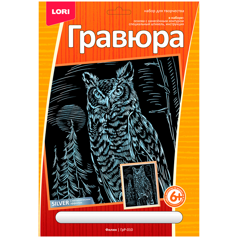 Гравюра - особый вид графического искусства. Сцарапывая верхний слой гравюры специальным штихелем, входящим в набор, ребёнок создает картину-гравюру. Состав: основа с контуром рисунка, штихель, инструкция