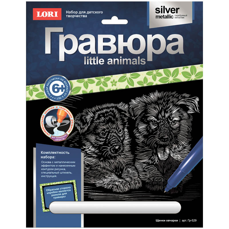 Гравюра - особый вид графического искусства. Сцарапывая верхний слой гравюры специальным штихелем, входящим в набор, ребёнок создает картину-гравюру. Готовую гравюру можно вставить в упаковку-рамку. Состав: основа с контуром рисунка, штихель, инструкция