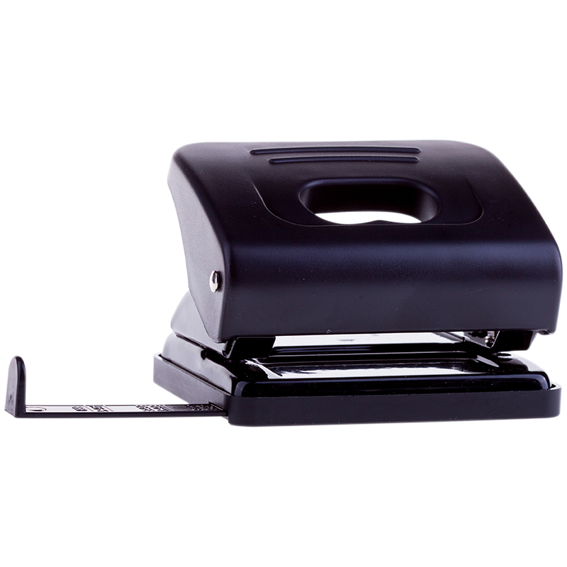 Дырокол пластиковый черный, пробивает до 20 листов, с линейкой