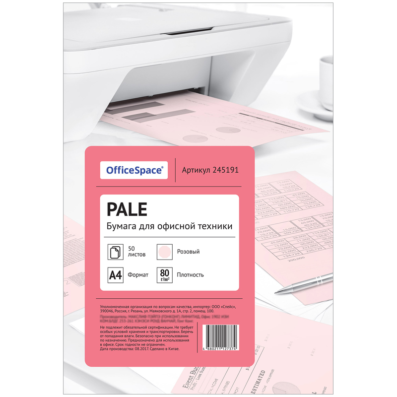 Цветная бумага формата А4, плотность 80 г/м2, цвет pale розовый, 50 листов, упаковка - пакет с клеевой полосой.