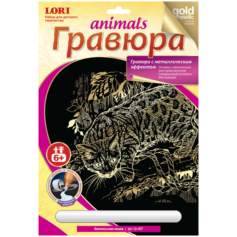 Контур рисунка уже нанесен на черный фон. С помощью специального штихеля изображение процарапывается, и из-под слоя краски появляется золотая основа. В результате получается контрастный рисунок. Комплектация - основа с контуром, штихель, инструкция. Упаковка - картонный пакет с европодвесом.