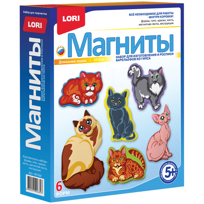Набор для изготовления магнитиков из гипса. Состав набора: гипс, пластиковые формы, акриловая краска 6 цветов, кисть, магнитная лента, инструкция