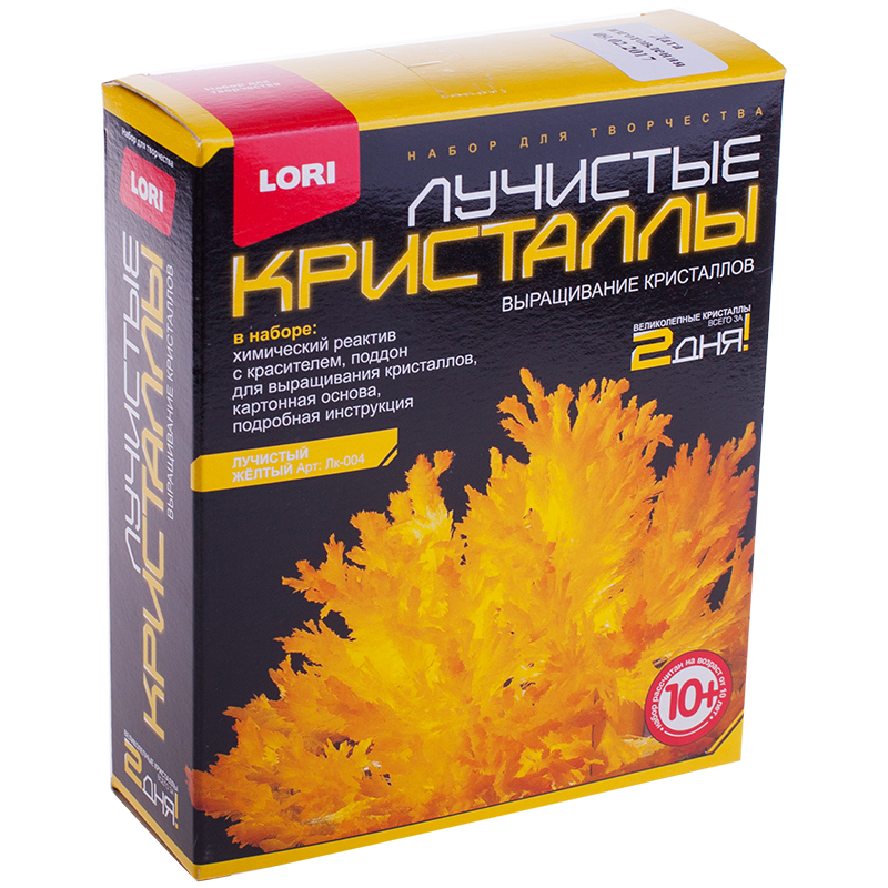 В состав набора входит химический реактив с красителем, поддон для выращивания кристаллов, картонная основа