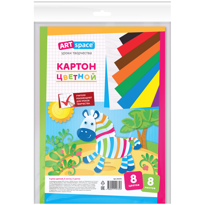 Цветной картон для детского творчества используется достаточно часто. Цветные листы служат отличным фоном для различных аппликаций, рисования, поделок, из них можно создавать самые разные поделки, вырезать плоские и объемные фигурки и заготовки, разукрашивать и оформлять их, строить домики, замки, ракеты, скворечники и даже лабиринты, создавать условия для игр с помощью картонных заготовок, делать маленькие поделки и сооружать гигантские конструкции, склеивая листы, мастерить кукольные домики и театры, т.к. картон легко гнётся, режется, красится, склеивается, прошивается и держит форму. Набор цветного картона ArtSpace станет незаменимым помощником в создании творческих шедевров. То, что нужно для детского творчества, развития мелкой моторики, зрительно-моторной координации, логического мышления и воображения!
