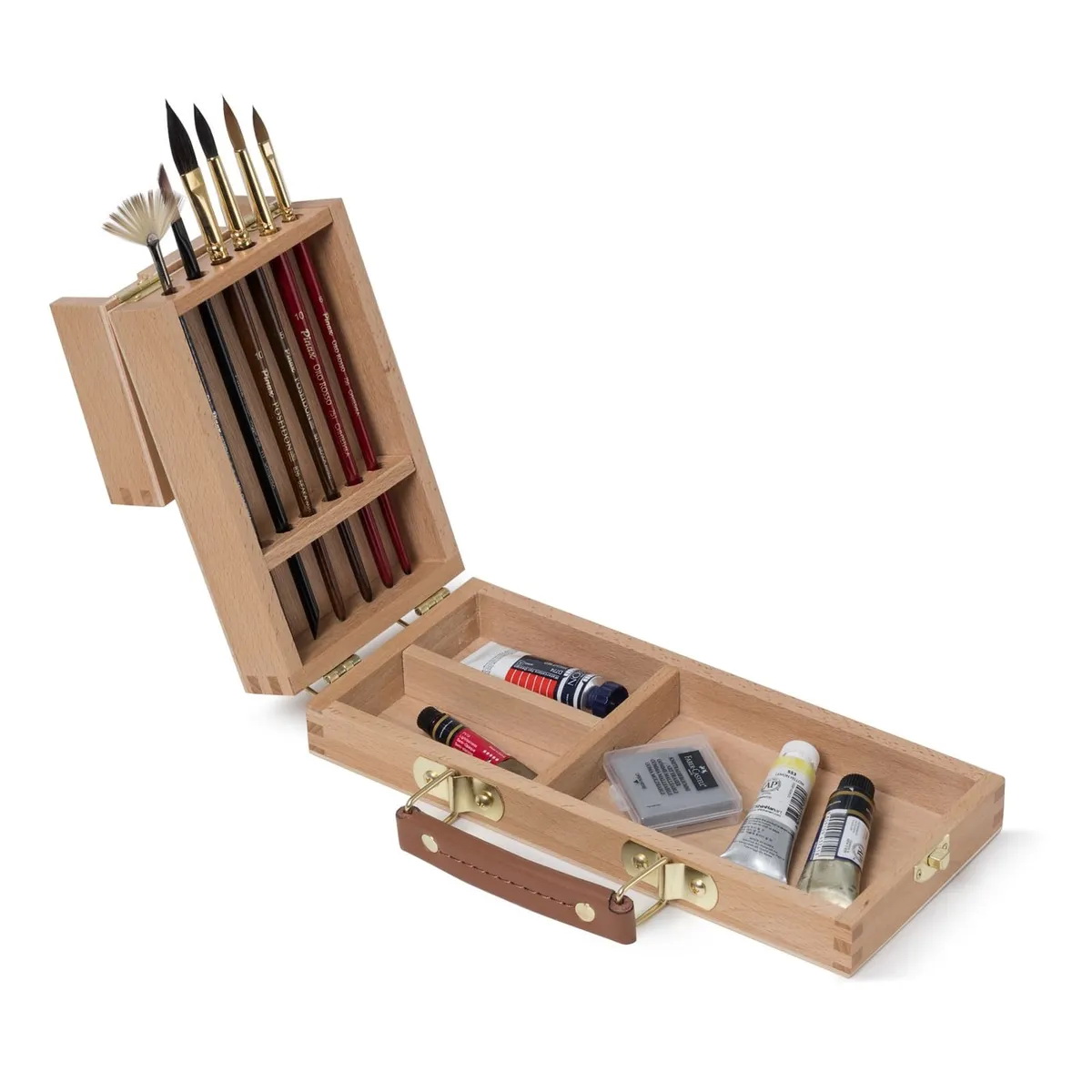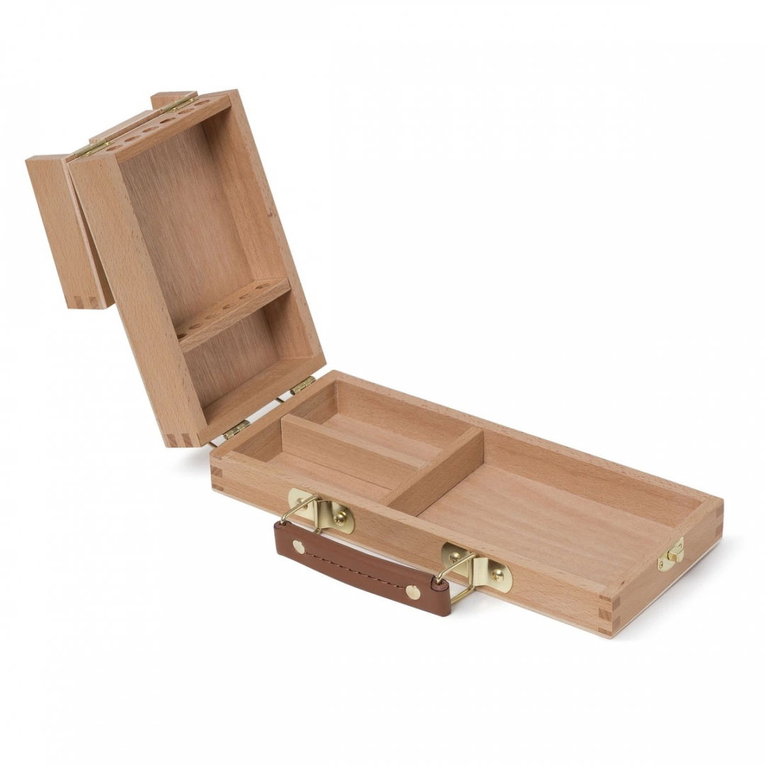 Ящик художника SB-1 (малый) с ячейками и пеналом для кистей и красок, 3-х секционный, бук Для кистей на короткой ручке.
