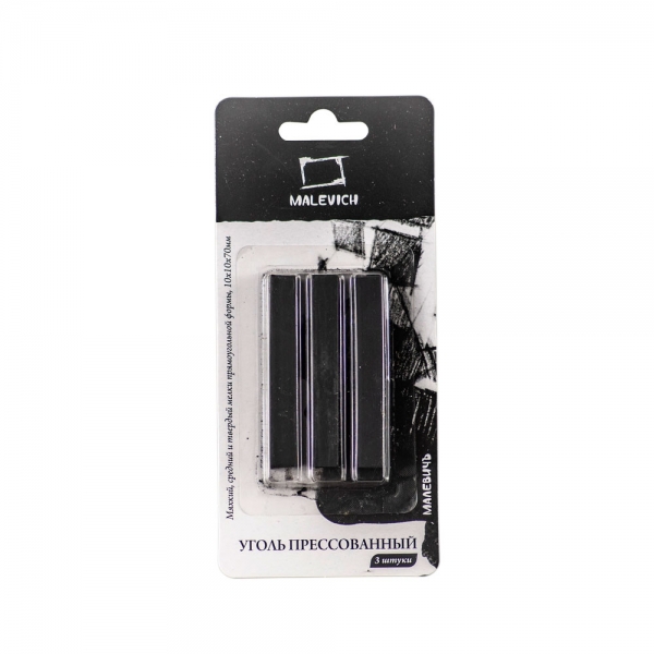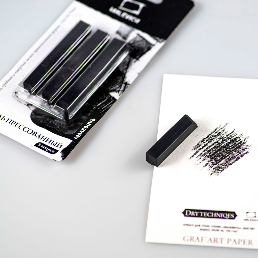 Пресованный уголь для рисования отлично подходит, когда нужен глубокий черный цвет. Оформлен в виде набора из трех мелков разной степени твердости - мягкий, средний, твердый.