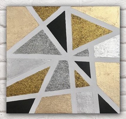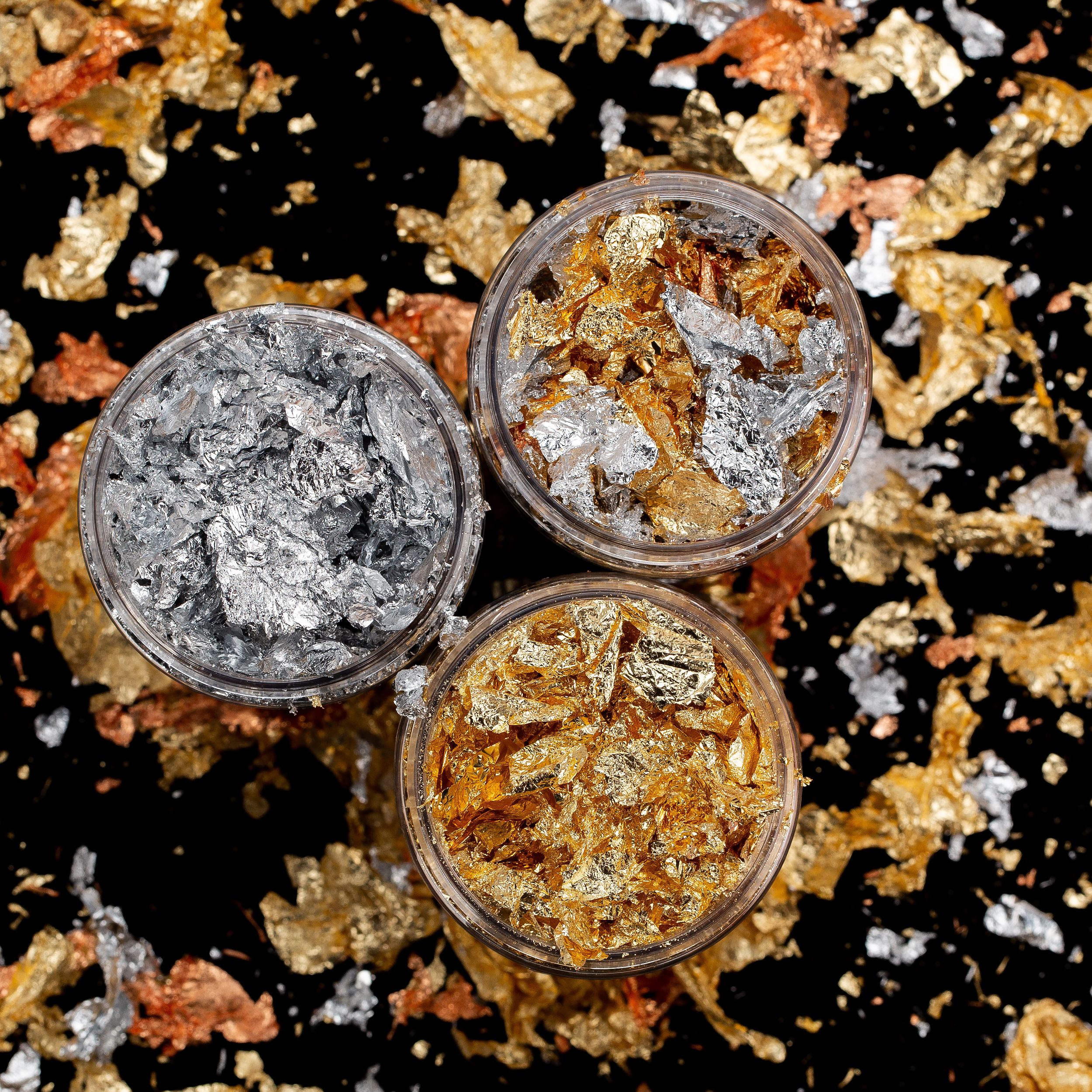 Удобство такой крошки заключается в повсеместном заполнении фактурной поверхности. Интересен декоративный эффект при смешении золотых, серебряных и бронзовых листочков друг с другом в разных пропорциях и хаотичном нанесении на ровную поверхность. А на рельефе такая "цветная" крошка нежелательна, так как зрительно теряются очертания рельефа под блеском и "разноцветностью".