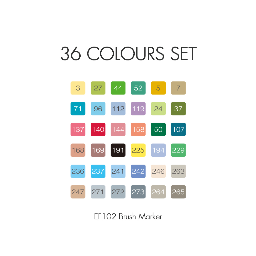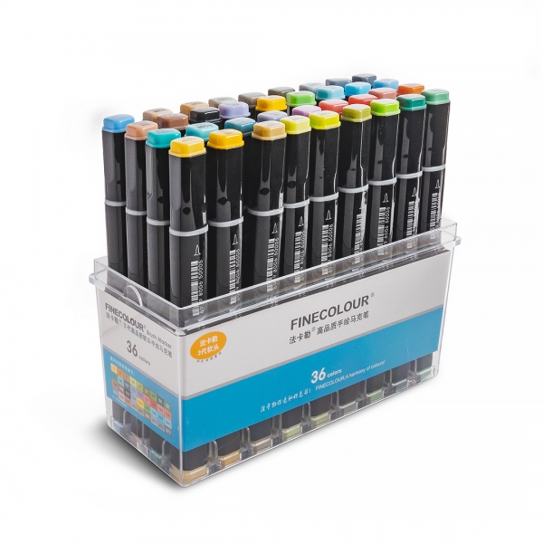 Набор маркеров FINECOLOUR BRUSH 36 цветов для скетчинга. Двухсторонние перезаправляемые спиртовые маркеры с японскими наконечниками высшего качества браш (гибкий, мягкий, иммитация кисти) и долото (широкий, твердый, толщина линии от 2 до 6 мл). Отличные показатели герметизации, благодаря чему наполнение внутри маркеров FINECOLOUR не сохнет. Колпачок открывается скручиванием, после использования должен быть плотно закрыт. Маркеры упакованы в прочный прозрачный пластиковый кейс с выкраской. Номер цвета указан на крышке каждого маркера с обеих сторон. В состав набора входят: Y3, YG27, YG44, G52, BG71, BG96, B112, V119, R137, R140, R144, YR158, E168, E169, 191, Y225, B236, B237, B241, B242, E247, CG271, CG272, CG273, Y5, YG7, YG24, YG37, G50, BG107, BV194, YG229, E246, YG263, YG264, YG265.