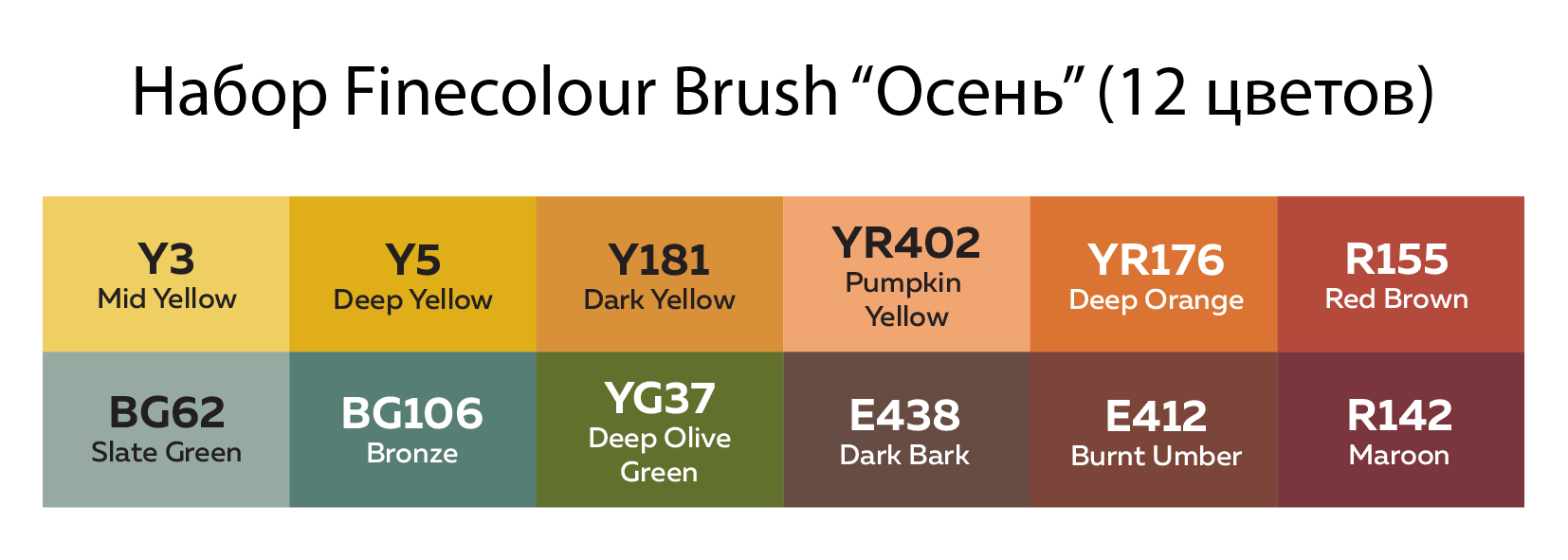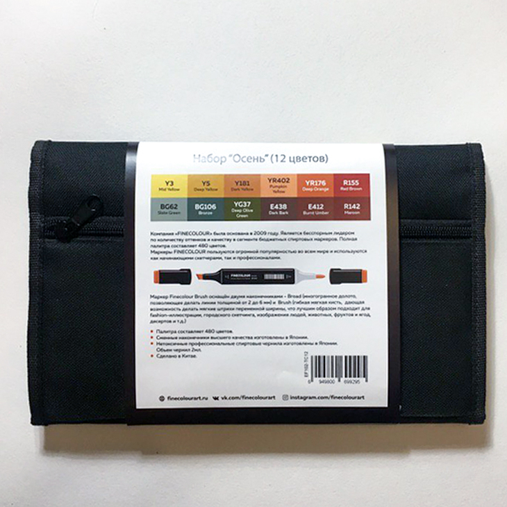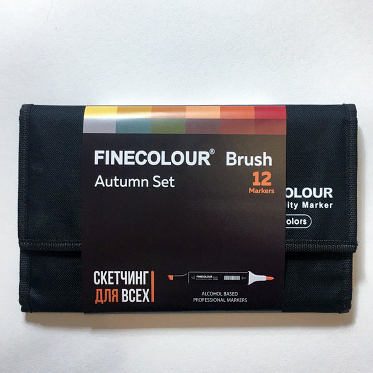Тематический набор маркеров FINECOLOUR BRUSH 12 цветов для скетчинга. Двухсторонние перезаправляемые спиртовые маркеры с японскими наконечниками высшего качества браш (гибкий, мягкий, иммитация кисти) и долото (широкий, твердый, толщина линии от 2 до 6 мл). Отличные показатели герметизации, благодаря чему наполнение внутри маркеров FINECOLOUR не сохнет. Колпачок открывается скручиванием, после использования должен быть плотно закрыт. Номер цвета указан на крышке каждого маркера с обеих сторон. Маркеры упакованы в удобный тканевый кейс-скрутку черного цвета. В состав набора входят: Y3, Y5, Y181, YR402, YR176, R155, BG62, BG106, YG37, E438, E412, R142.
