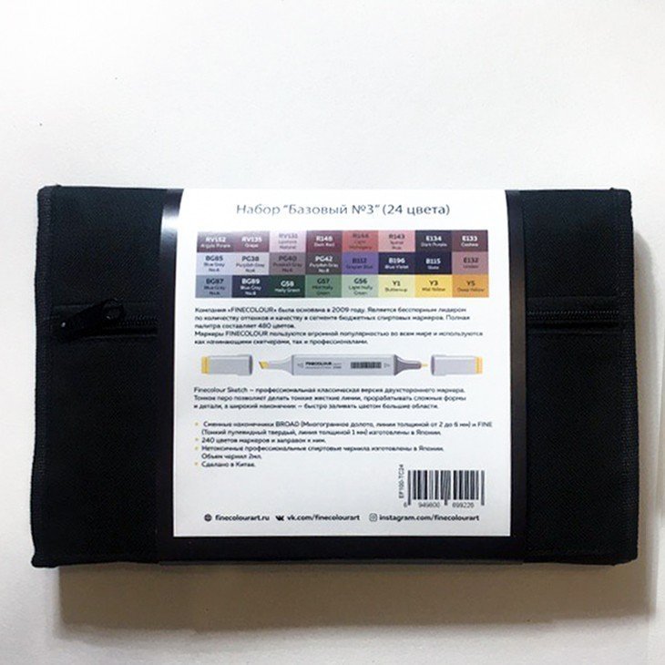 Тематический набор маркеров FINECOLOUR BRUSH 24 цвета для скетчинга. Двухсторонние перезаправляемые спиртовые маркеры с японскими наконечниками высшего качества браш (гибкий, мягкий, иммитация кисти) и долото (широкий, твердый, толщина линии от 2 до 6 мл). Отличные показатели герметизации, благодаря чему наполнение внутри маркеров FINECOLOUR не сохнет. Колпачок открывается скручиванием, после использования должен быть плотно закрыт. Номер цвета указан на крышке каждого маркера с обеих сторон. Маркеры упакованы в удобный тканевый кейс-скрутку черного цвета. В состав набора входят: Y223, Y389, YR394, YR178, R147, R145, R404, R215, E162, E20, E169, G61, YG450, YG29, R148, R140, E406, NG276, NG278, V119, V121, E412, E429, E411.