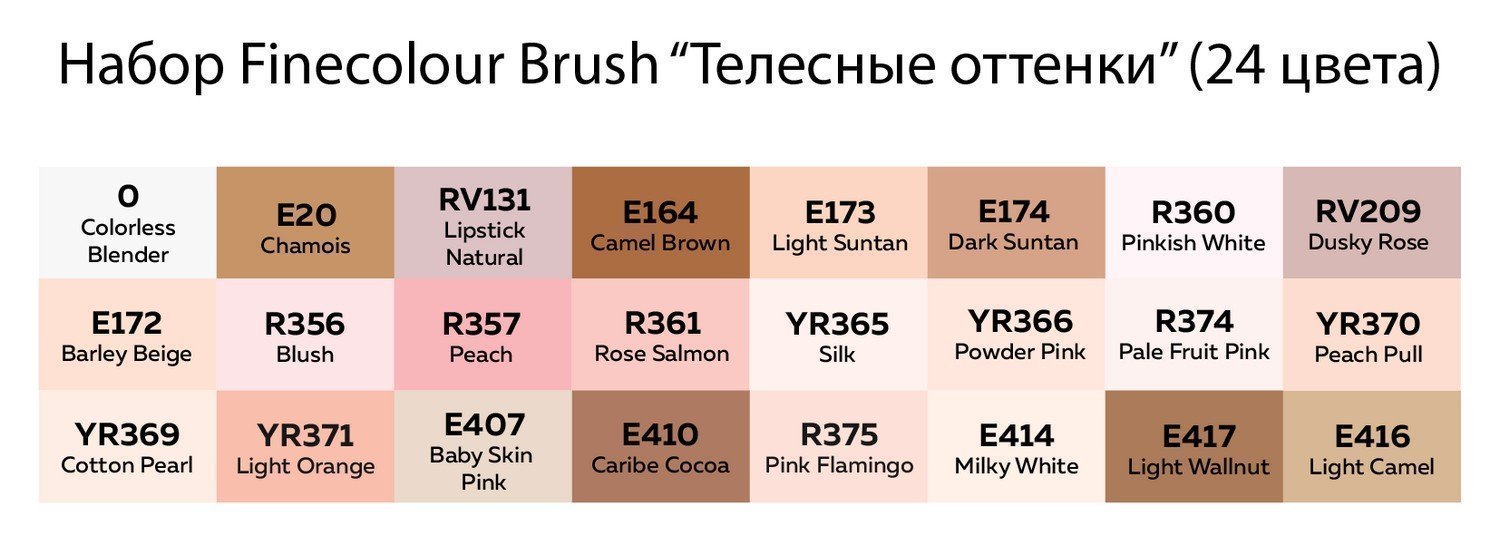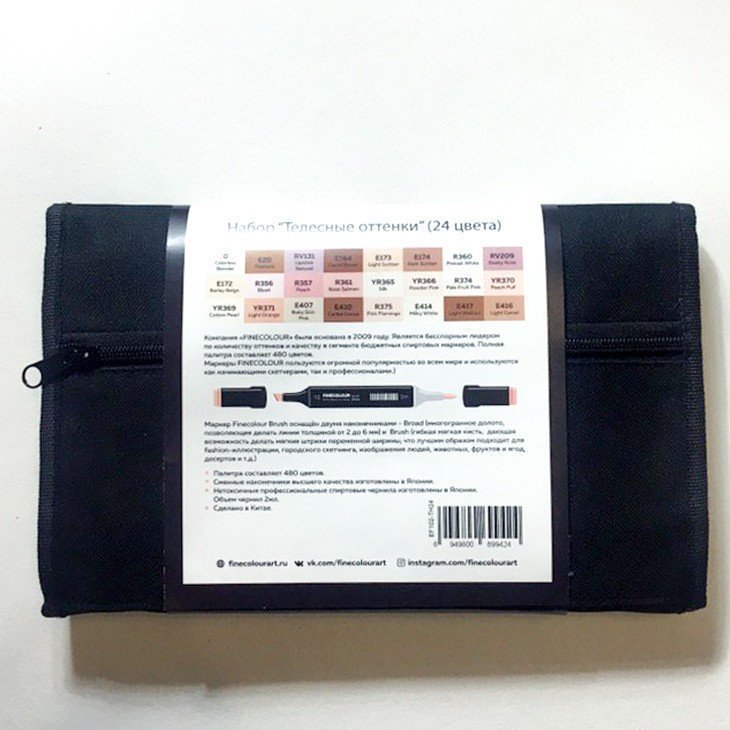 Тематический набор маркеров FINECOLOUR BRUSH 24 цвета для скетчинга. Двухсторонние перезаправляемые спиртовые маркеры с японскими наконечниками высшего качества браш (гибкий, мягкий, иммитация кисти) и долото (широкий, твердый, толщина линии от 2 до 6 мл). Отличные показатели герметизации, благодаря чему наполнение внутри маркеров FINECOLOUR не сохнет. Колпачок открывается скручиванием, после использования должен быть плотно закрыт. Номер цвета указан на крышке каждого маркера с обеих сторон. Маркеры упакованы в удобный тканевый кейс-скрутку черного цвета. В состав набора входят: 0, E120, RV131, E164, E173, E174,R360, RV209, E172, R356, R357, R361, YR365, YR366, R374, YR370, YR369, YR371, E407, E410, R375, E414, E417, E416.