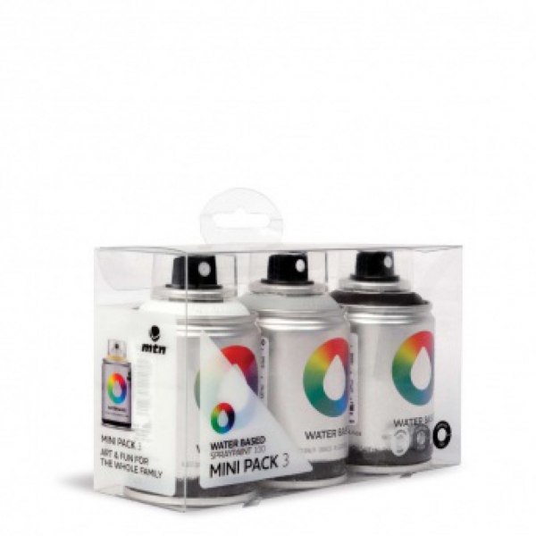 Набор аэрозольной краски на водной основе MTN Water Based для граффити, живописи и декора. 3 баллона по 100 мл, цвета в наборе: угольный черный RV-9011, титановый белый RV-9010, нейтральный серый RV-7040 . Упакован набор в прозрачный пластиковый кейс с блистером. Свойства краски: матовая, укрывистая, светостойкая, быстросохнущая, низкое давление. Краску можно использовать даже в плохо проветриваемом помещении, она низкотоксична, не имеет резкого запаха, не содержит свинец и другие тяжелые металлы. Также подходит для внешних работ, светостойкий пигмент обеспечит защиту от выцветания и выгорания при воздействии с окружающей средой. Дополнительно рекомендуется покрыть лаком (матовым или глянцевым) этой же линейки. Срок годности: 5 лет, хранить при t не ниже 8o, t рабочей поверхности 5-50o.