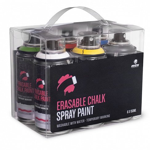 Набор аэрозольной краски MTN PRO Erasable Chalk Paint на меловой основе. Отличное решение для временного декора помещений, краска легко смывается водой. Если требуется долговечный эффект, можно закрепить лаком. В наборе 6 баллонов по 150 мл, цвета: светло-желтый 1020W, светло-красный 3020W , синий электрик 0030W, зеленый травяной 6018W, белый 9010W, черный 9011W. Упакован набор в прозрачный пластиковый кейс с блистером. Свойства краски: матовая, стираемая, укрывистая, быстросохнущая, почти без запаха, биоразлагаемая. Подходит для непористых поверхностей и, благодаря своему эко-составу, для нанесения на природные поверхности (растения, деревья, трава, камни). Краска высыхает за 20 минут. После высыхания не размазывается. Срок годности: 5 лет, хранить при t не ниже 8o, t рабочей поверхности 5-50o.