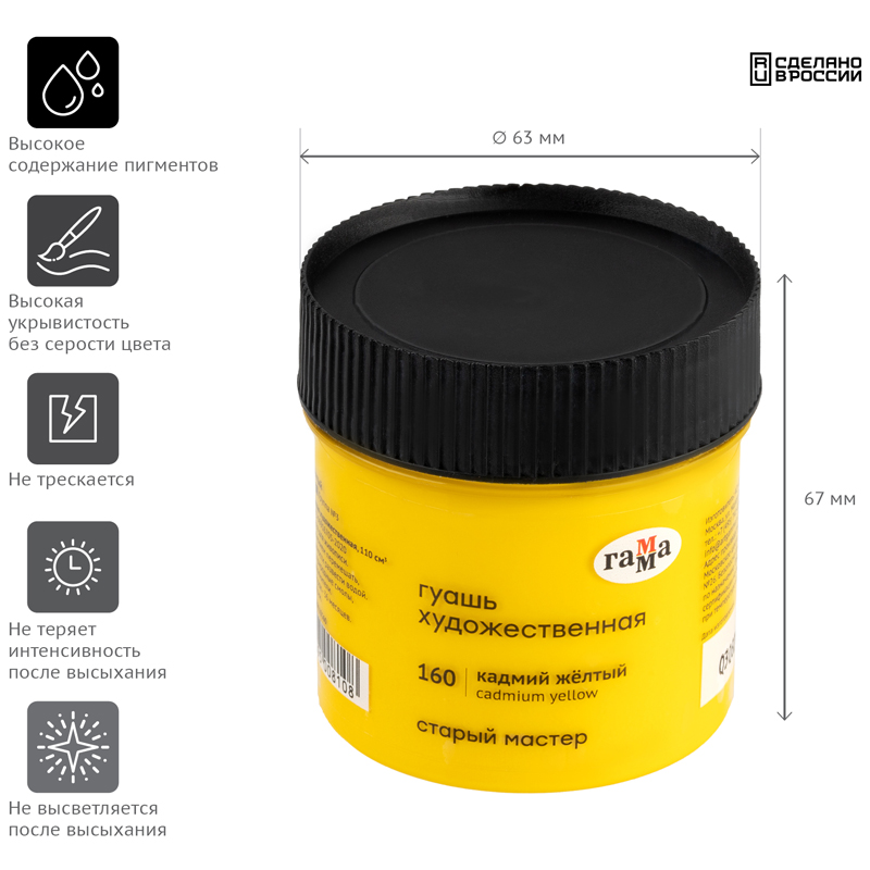 Гуашь имеет уникальную рецептуру, разработанную в собственной исследовательской лаборатории завода совместно с художниками.