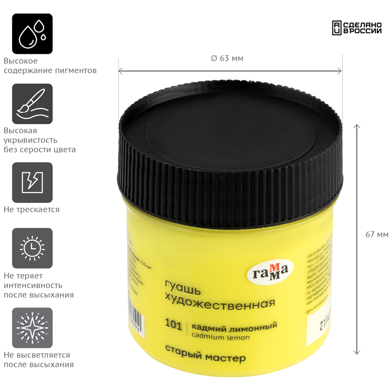 Гуашь имеет уникальную рецептуру, разработанную в собственной исследовательской лаборатории завода совместно с художниками.