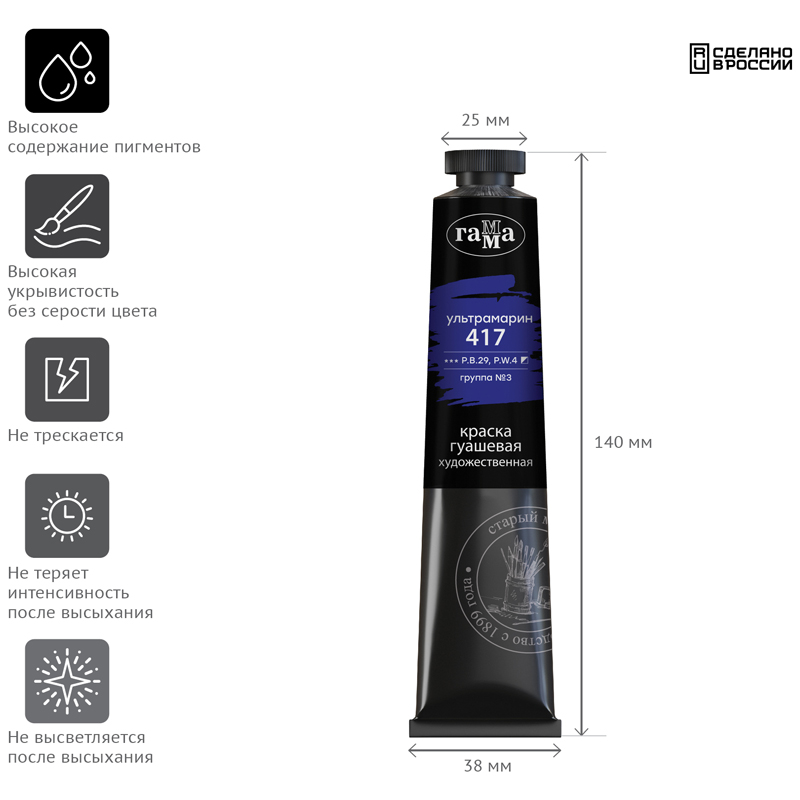 Гуашь имеет уникальную рецептуру, разработанную в собственной исследовательской лаборатории завода совместно с художниками.