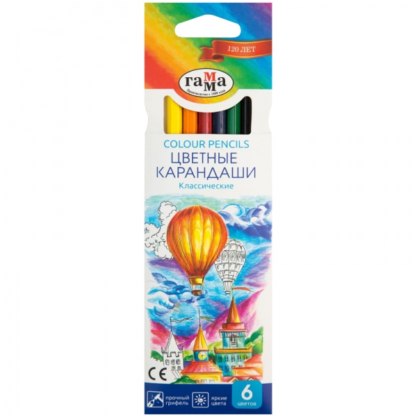 Карандаши цветные Гамма "Классические", 06цв., заточен., картон, европодвес