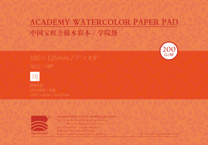 Склейка для акварели "Baohong", 100% хлопок, 200 гр/м2, Мелкозернистая, 12,5x18см, 10л