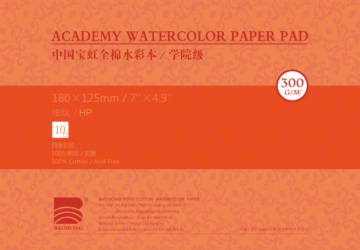 Склейка для акварели "Baohong", 100% хлопок, 300 гр/м2, Мелкозернистая, 12,5x18см, 10л