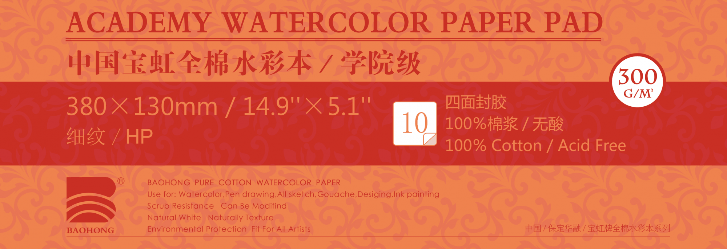 Склейка для акварели "Baohong", 100% хлопок, 300 гр/м2, Мелкозернистая, 13x38см, 10л