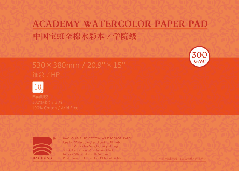 Бумага из хлопка для акварели от китайского производителя Baohong, который полюбился многим художникам в России качеством материала, которое за свою небольшую цену нисколько не уступает брендам. За счет состава из хлопка на бумаге можно работать в многослойной технике, заливка яркая и равномерная. Бумагу практически не ведет, на фактуре мелкозернистая и среднезернистая легко удается добиться детализации рисунка, она не съедает цвет.