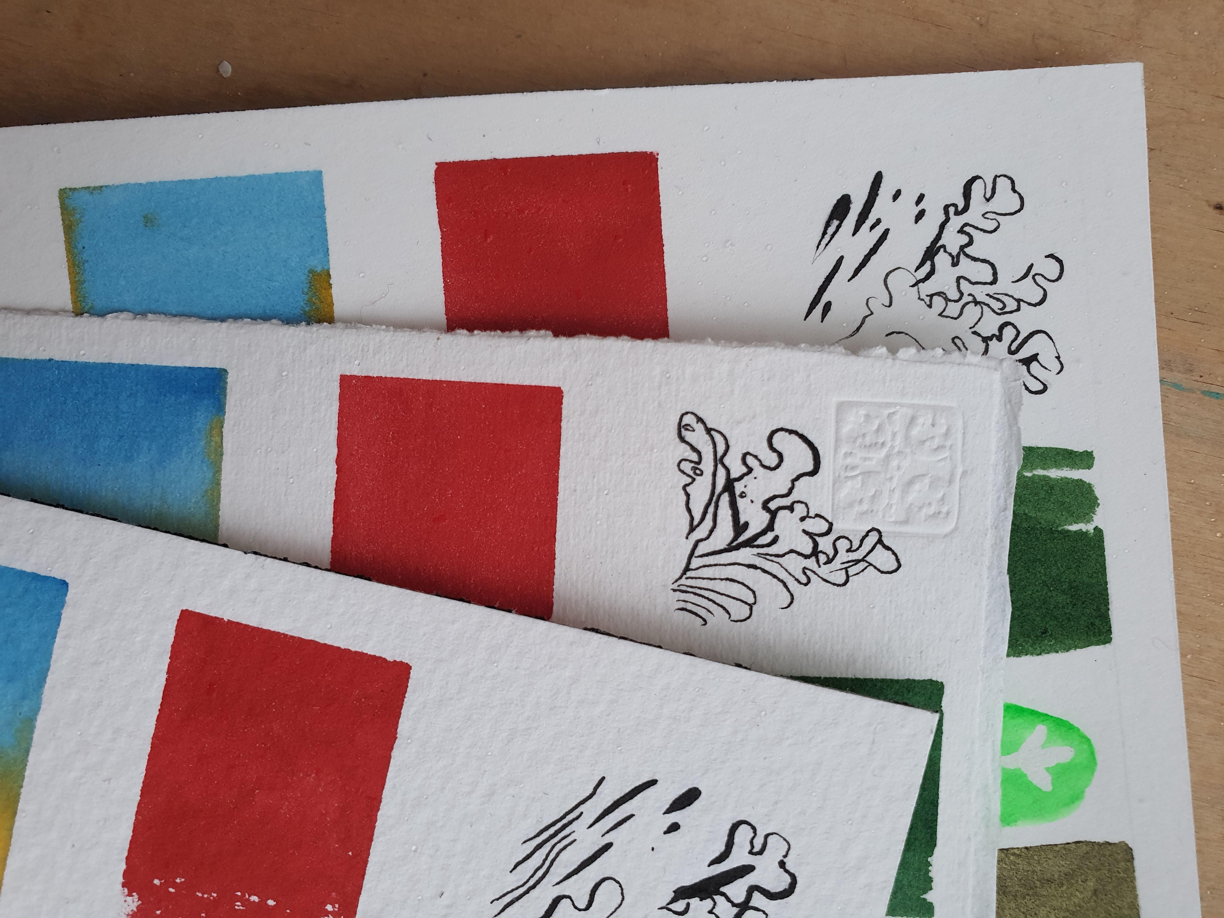 Сложилось общее впечатление, что эта бумага создана для экстремальных влажных техник, потому что она невероятно стабильна во влажном состоянии, быстро и много пьёт. Быстро стабилизируется и выдаёт очень благородный результат даже при неделикатном использовании. Бумага прекрасно показала себя во всех тестах. Особенно понравилось полное отсутствие деформации на обратной стороне листа - если положить использованные листы и свежие рядом- то не заметно разницы.