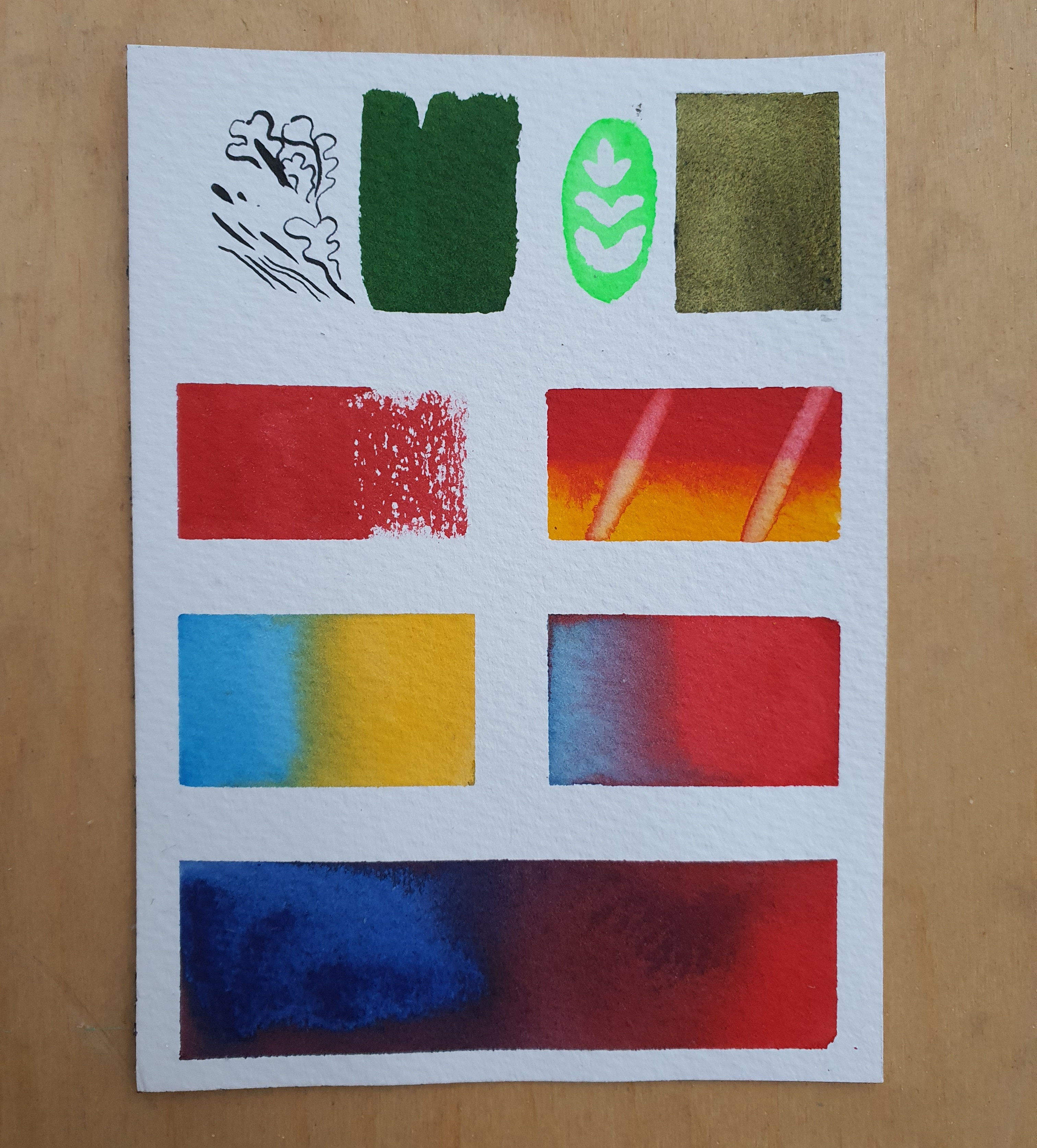 Краски: Van Gogh, Dusk Yellow, Неоновая зеленая Movemoon, Mijello, Permanent yellow deep, Mijello, Ceruleum, PWC, Phtalo Blue(Red Shade), PWC, Permanent red.