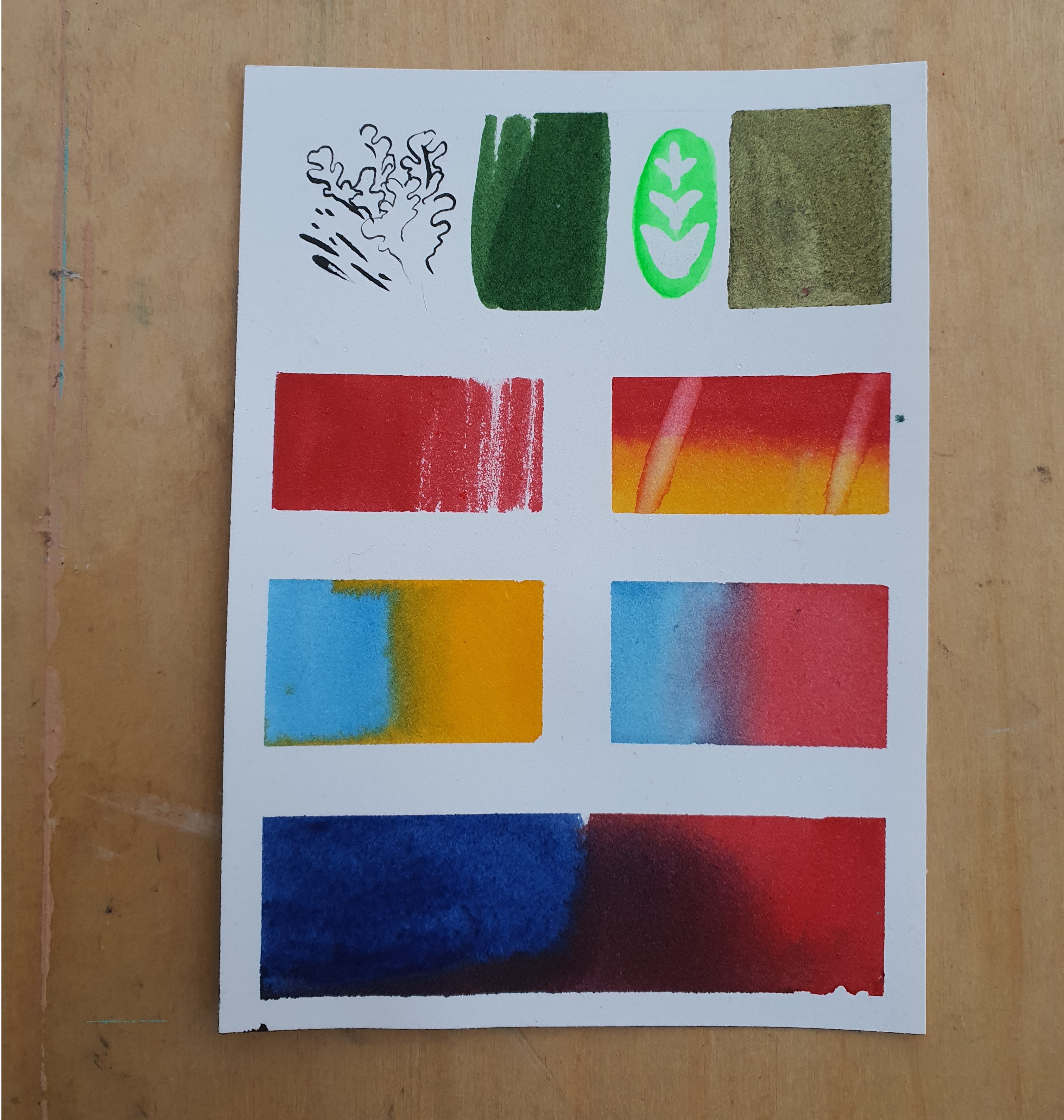 Краски: Van Gogh, Dusk Yellow, Неоновая зеленая Movemoon, Mijello, Permanent yellow deep, Mijello, Ceruleum, PWC, Phtalo Blue(Red Shade), PWC, Permanent red.