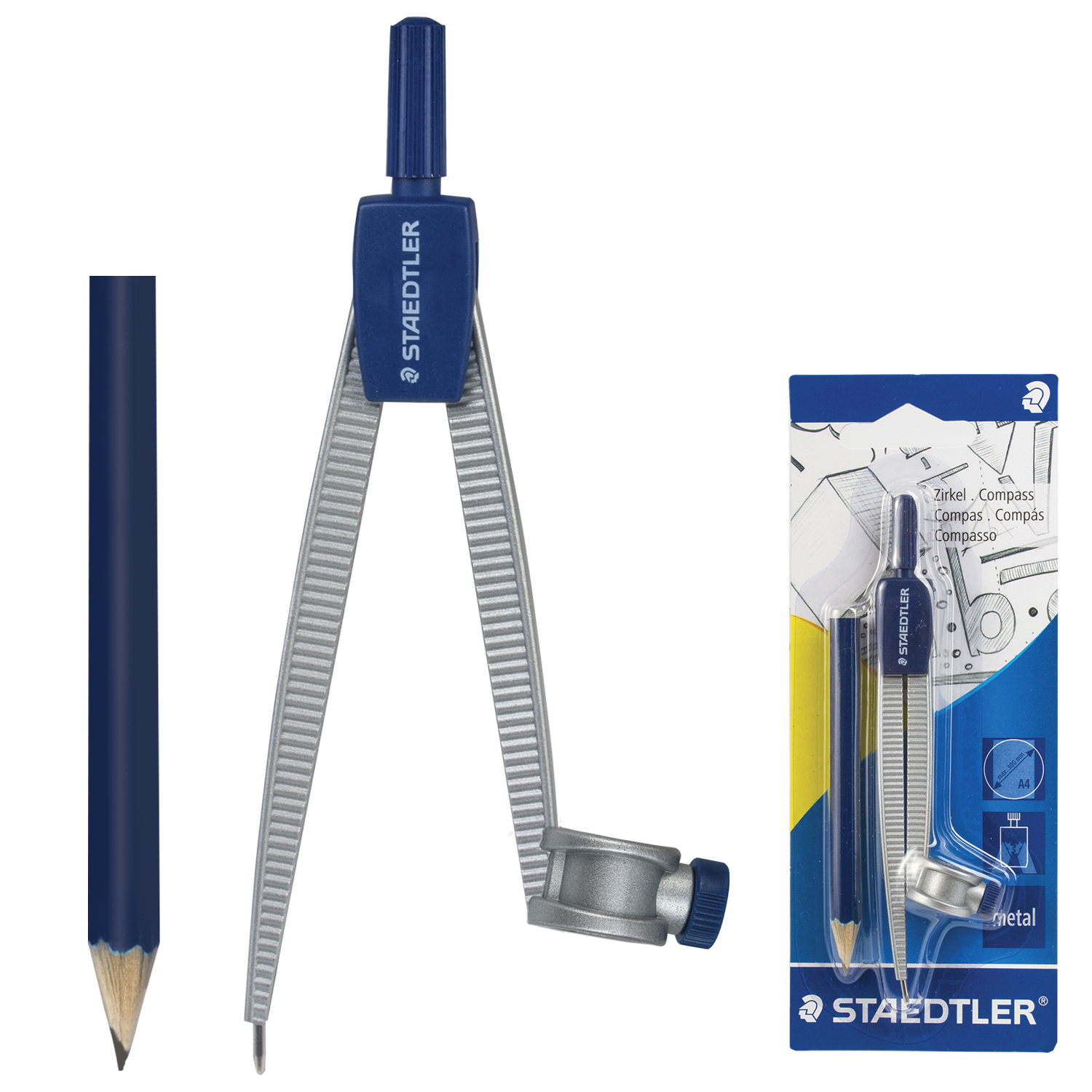 Металлический циркуль со встроенным универсальным адаптером, карандаш в комплекте.