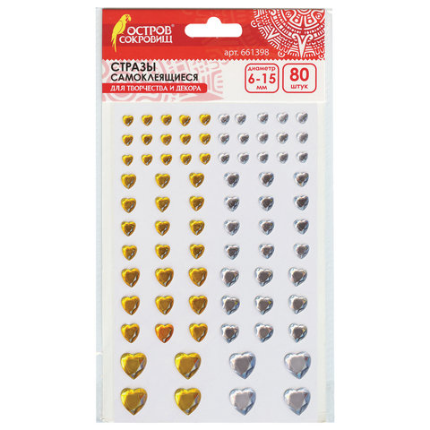 Стразы самоклеящиеся "Сердце", 6-15мм, 80 шт, цвет золотой/серебристый, на подложке