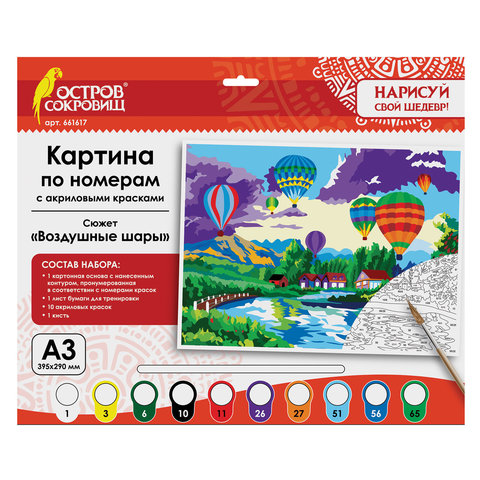 Работа над картиной развивает внимательность, усидчивость, аккуратность. Состав набора: 1 картонная основа с контуром, пронумерованная в соответствии с номерами красок, 1 лист бумаги для тренировки, акриловые краски и кисть.