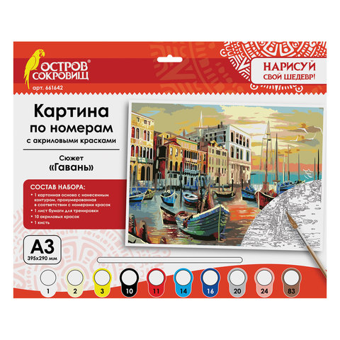 Работа над картиной развивает внимательность, усидчивость, аккуратность. Состав набора: 1 картонная основа с контуром, пронумерованная в соответствии с номерами красок, 1 лист бумаги для тренировки, акриловые краски и кисть.