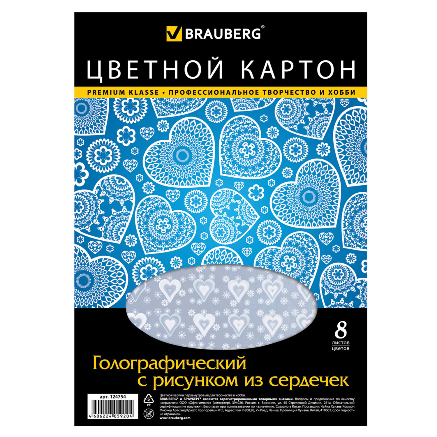 Картон цветной А4 ГОЛОГРАФИЧЕСКИЙ СЕРДЕЧКИ, 8 листов 8 цветов, в папке, 230 г/м2, A4