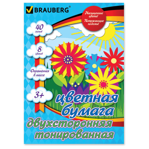 Набор цветной двухсторонней тонированной бумаги BRAUBERG предназначен для творчества, хобби, моделирования. Подходит для детей в возрасте от 3 лет, для развития моторики и фантазии. Плотность - 80 г/м2.