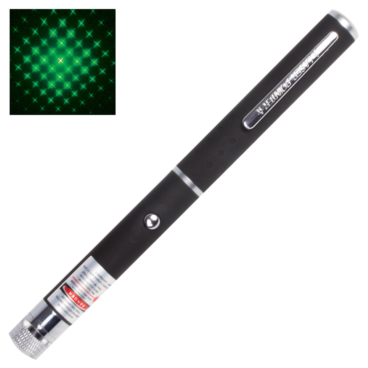 Лазерная указка с зеленым лучом и одной сменной насадкой - звездное небо. Является эффективным средством для привлечения внимания аудитории к информации, отображенной на доске или экране.