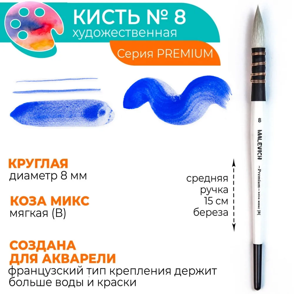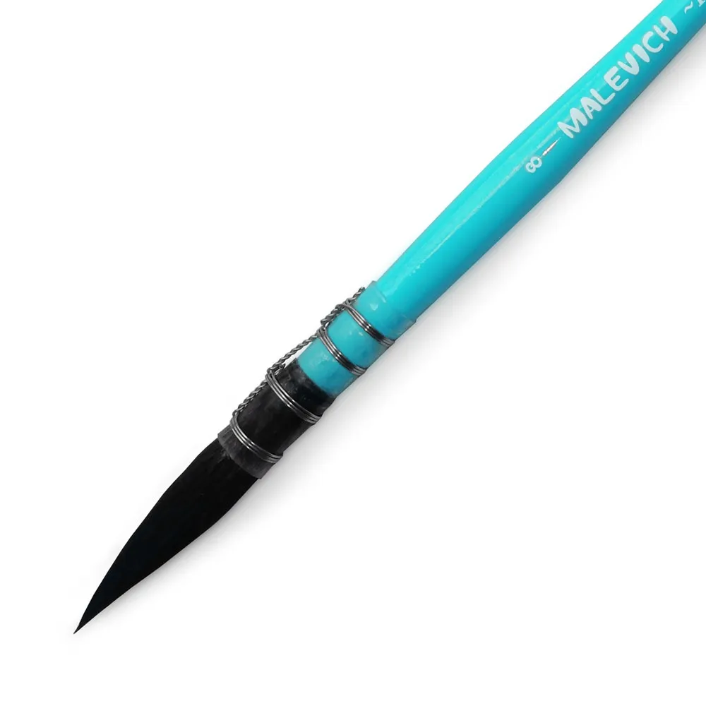 Серия Малевичъ Premium – кисти для профессиональной работы акварелью, каллиграфии и китайской живописи. Микс натурального беличьего ворса и специальной мягкой синтетики позволяет получить управляемую кисть, которая держит много воды и краски. Тонкий кончик позволяет прорабатывать мелкие детали, а большой объем пучка удобен для заливок. Французский тип крепления пучка, ручная скрутка. Лакированная березовая ручка длиной 15 см лазурного цвета.