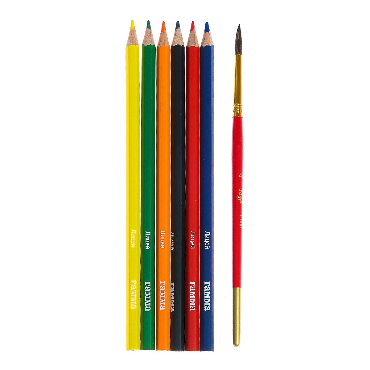 В набор входят мягкая круглая кисть №4 из волоса пони и 6 карандашей следующих цветов:
