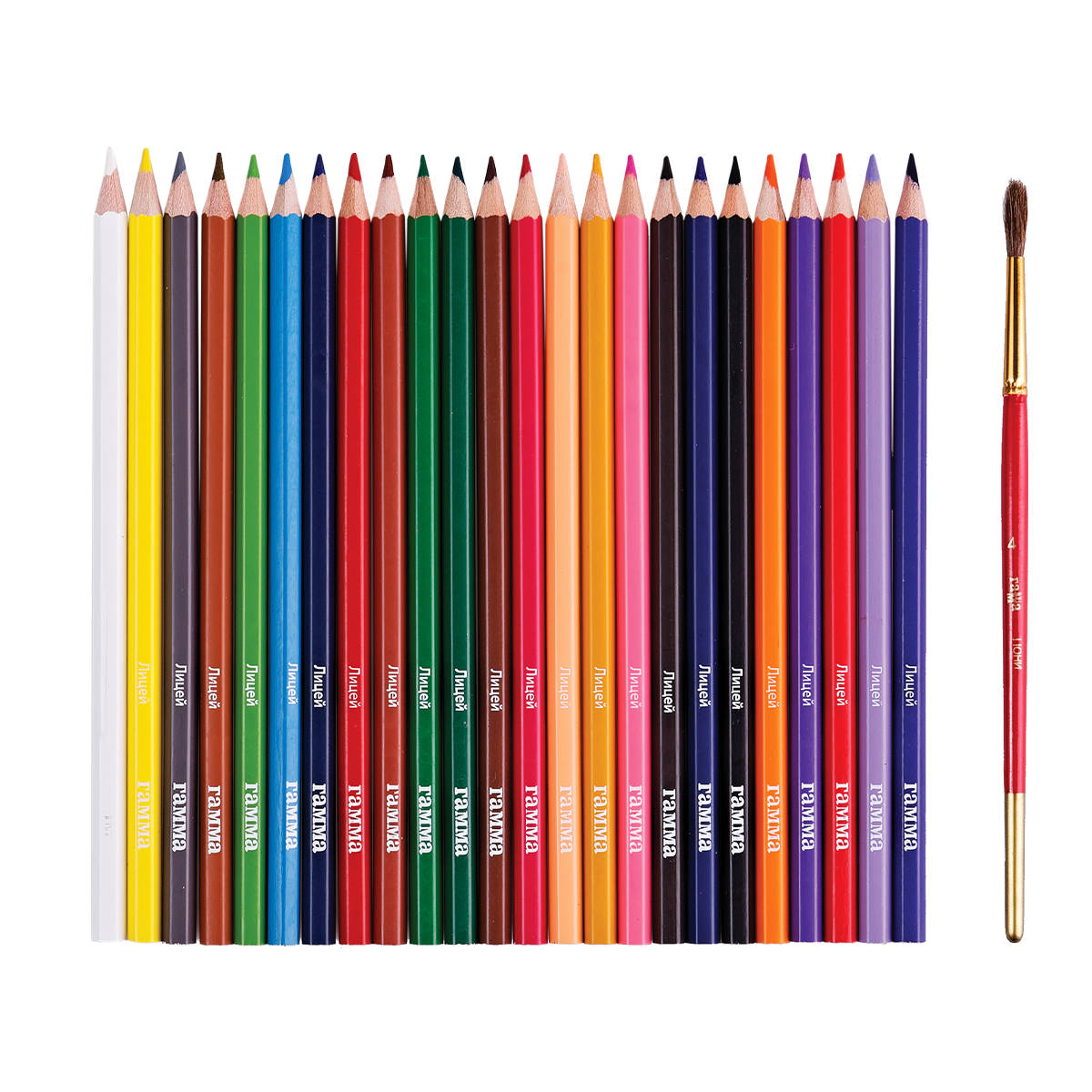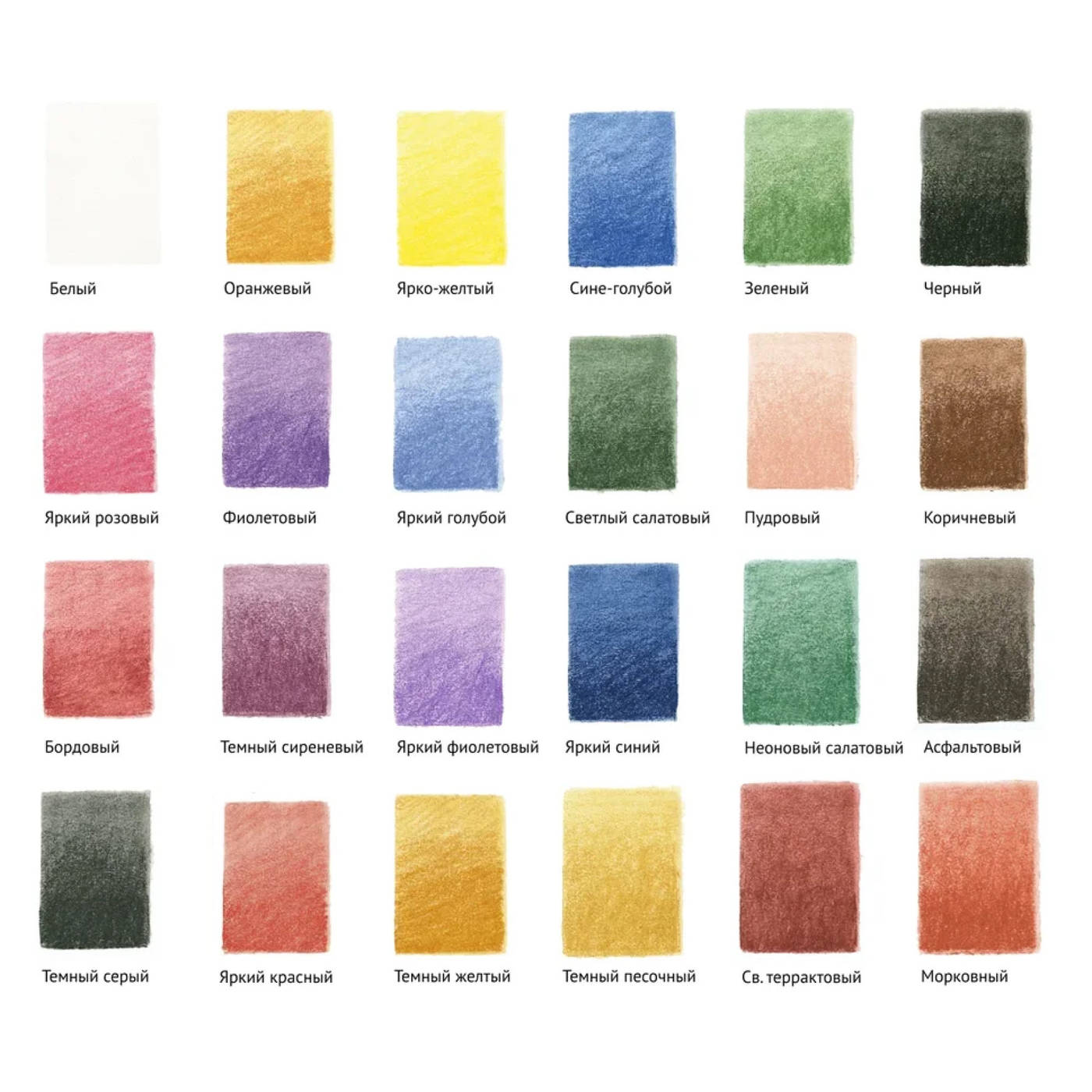 В набор входят мягкая круглая кисть №4 из волоса пони и 24 карандаша следующих цветов: