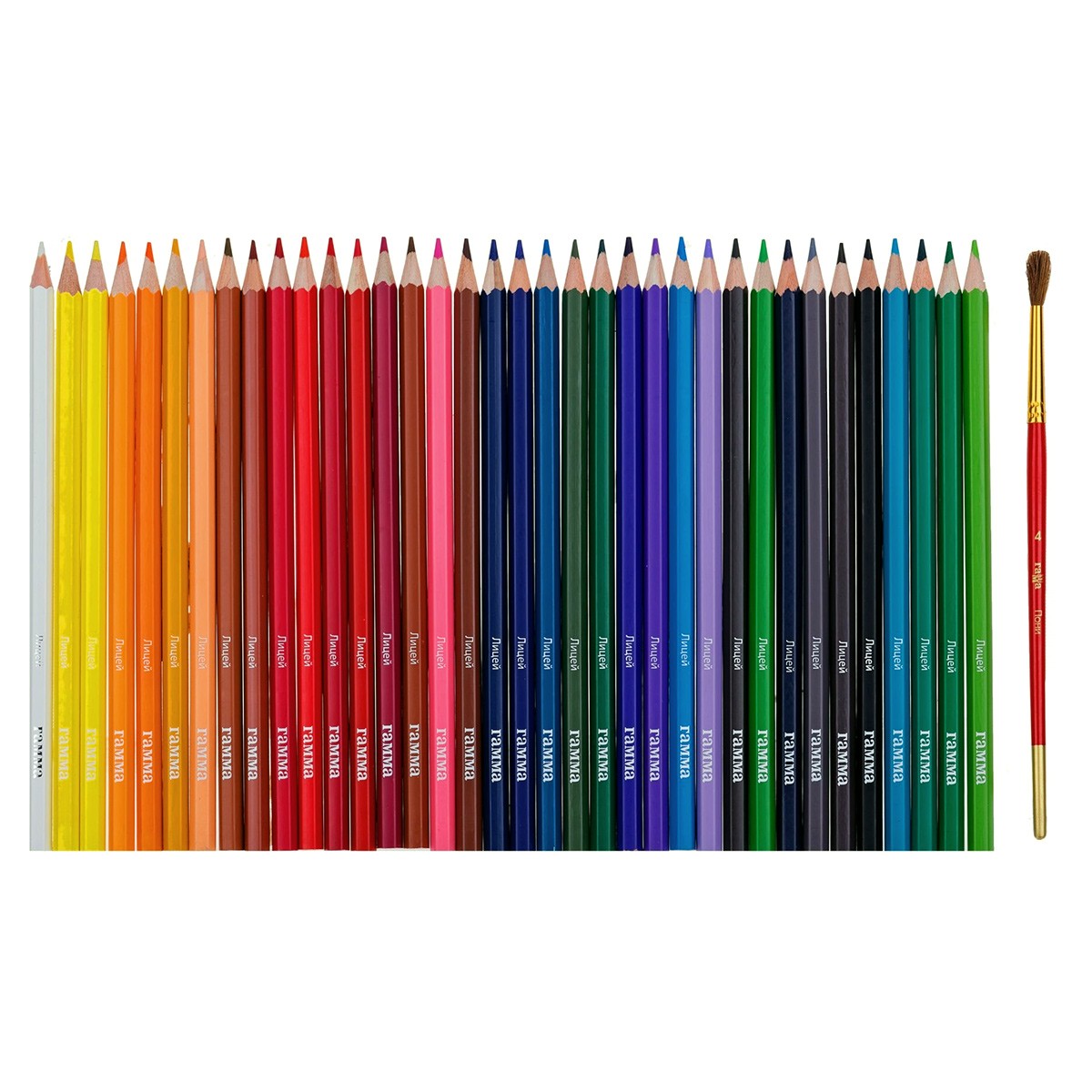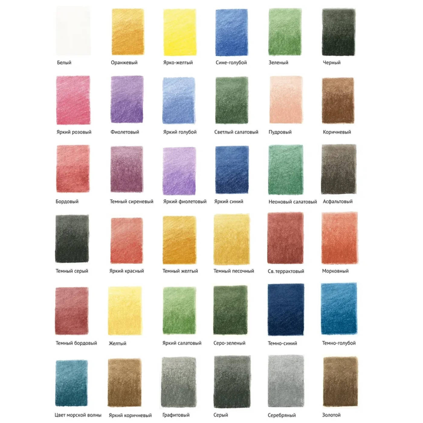 В набор входят мягкая круглая кисть №4 из волоса пони и 36 карандашей следующих цветов: