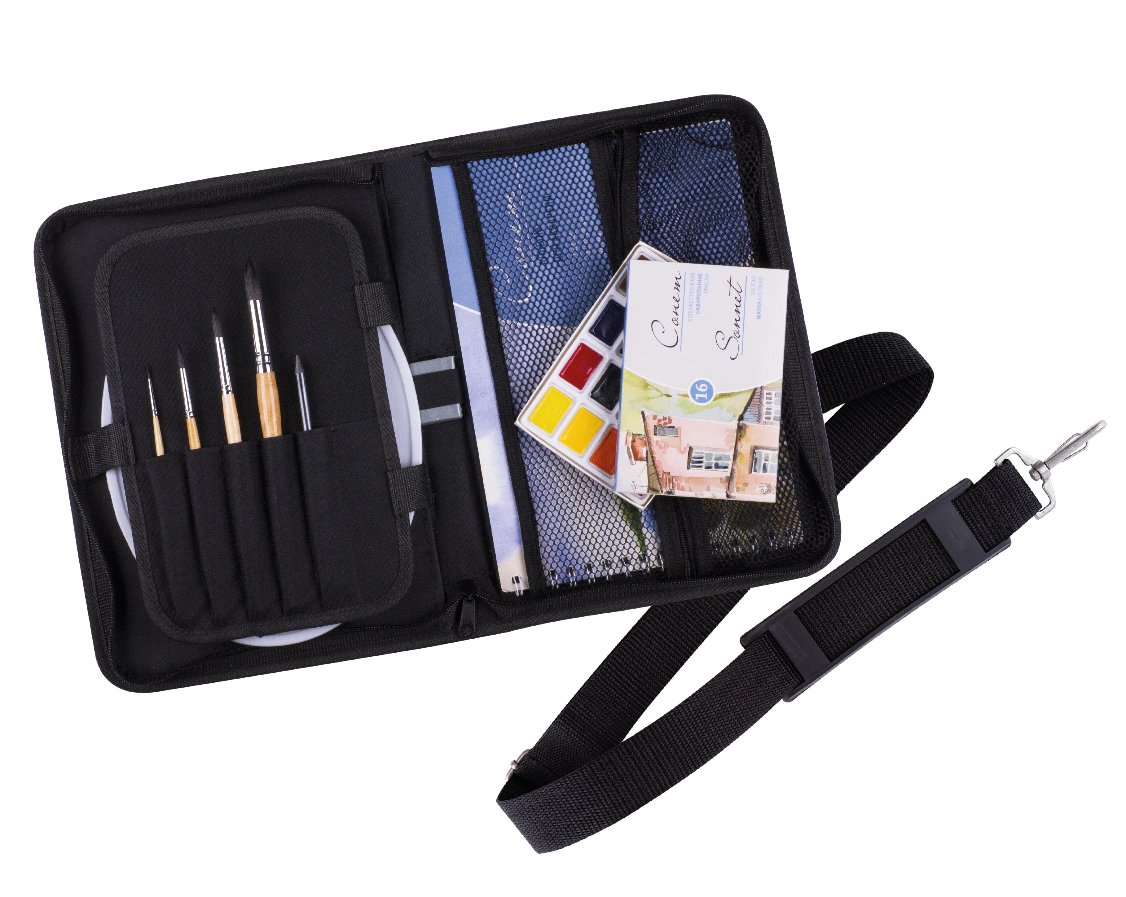 Невероятно удобная и универсальная сумка для художника «Сонет» подходит для переноски художественных принадлежностей и бумаги до А4 формата. Имеет внутренний органайзер для кистей, красок, палитры и других аксессуаров. Сумку можно носить на плече или как классическую сумку в руке.