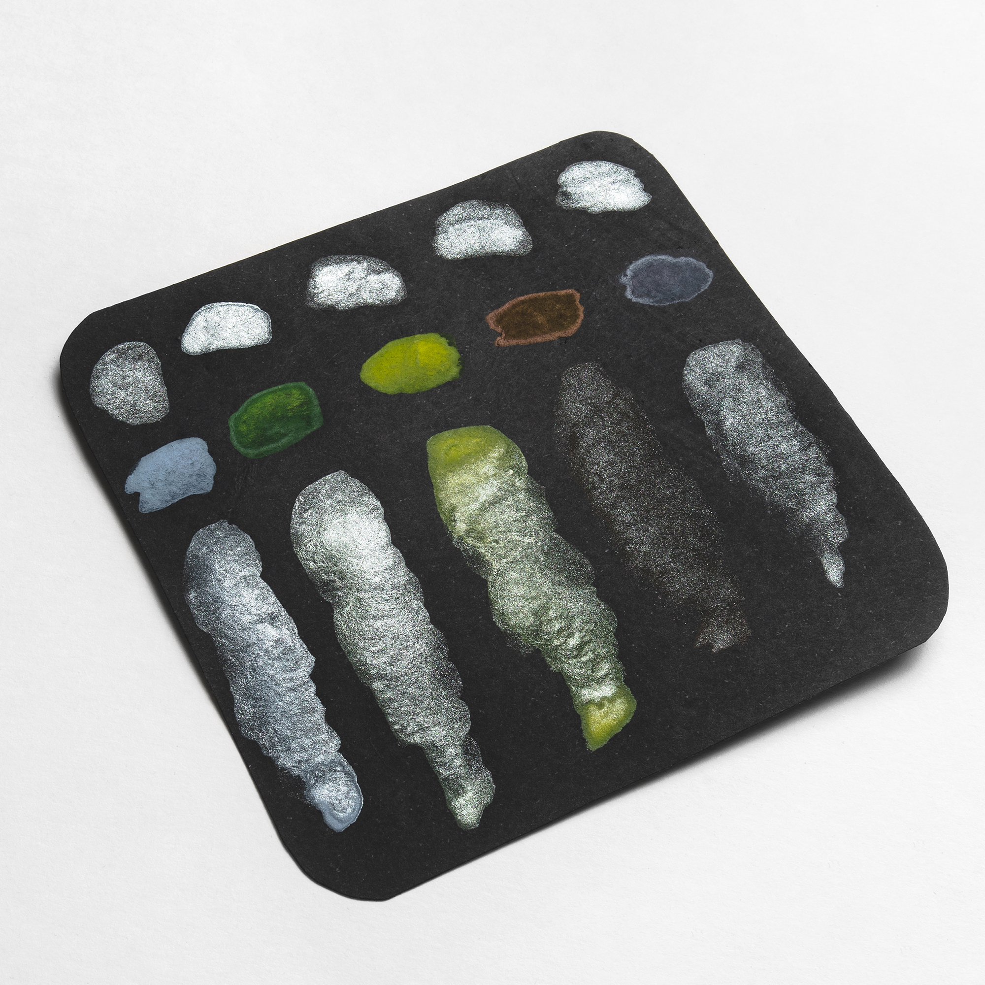 Набирается с ощутимым расходом, Хорошо «играет» только на тёмной бумаге, но может лучше всего работать в смесях, добавляя ненавязчивый холодный блеск любому оттенку. При концентрированном нанесении – такой же плотный как все остальные металлики.