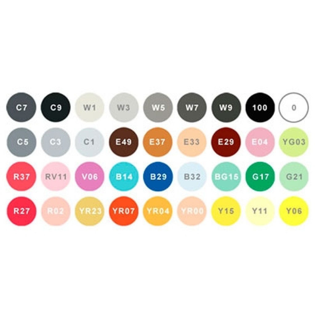Набор состоит из оттенков: Y11, Y13, Y15, YR04, YR24, R02, R08, RV11, RV29, V09,B05, B06, B14, B29, B32, B39, G07, G17, G21, G28, YG03, E09, E29, E33, C-1, C-3, C-5, C-7, C-9, W-1, W-3, W-5, W-7, W-9, 100, 110 и поставляется в удобном пластиковом боксе.