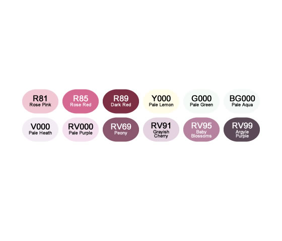 Цвета в наборе: R81, R85, R89, Y000, G000, BG000, V000, RV000, RV69, RV91, RV95, RV99, поставляется в удобном пластиковом боксе.