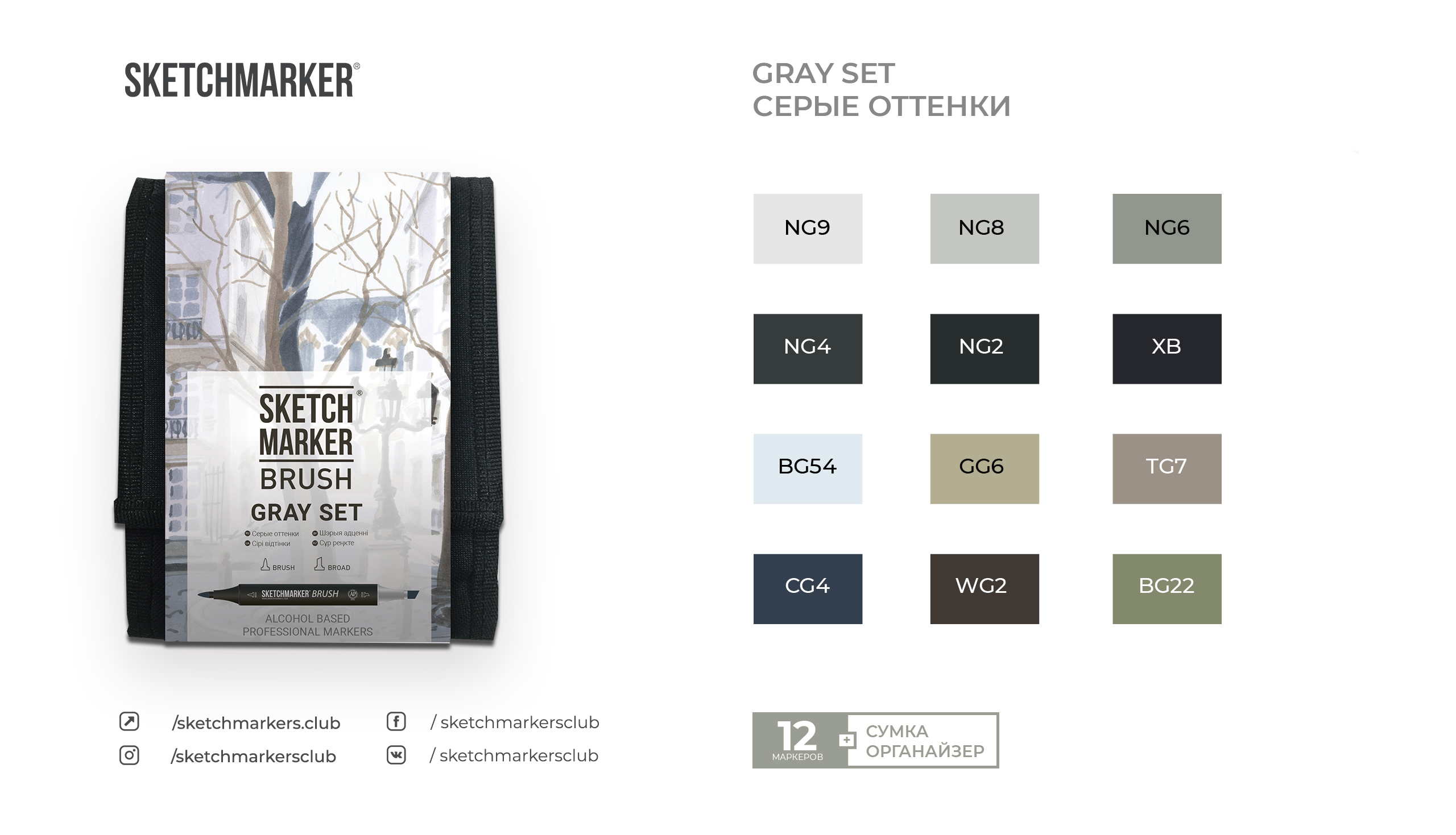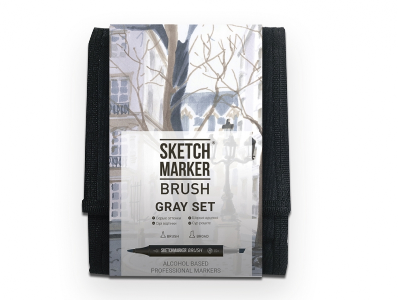 Набор маркеров Sketchmarker BRUSH Gray Set 12шт серые оттенки + сумка органайзер